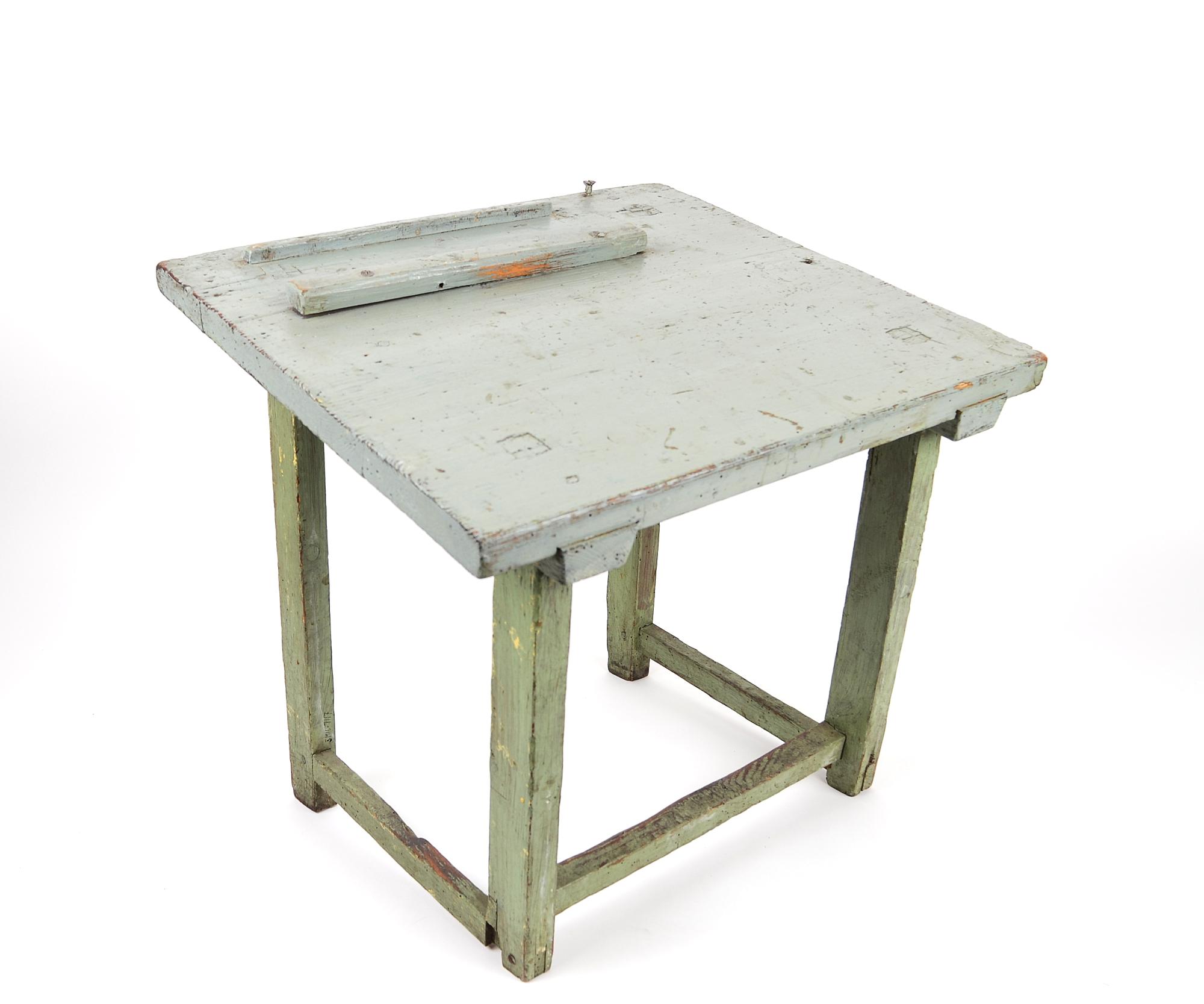 Korgmakarbänk i trä, målad i ljusgrön. Består av en lutande skiva med två träribbor samt en grov skruv. Underrede med tre slån. Har tillhört korgmakare Carl Andersson i Lidköping och är en gåva från dennes arvingar.
