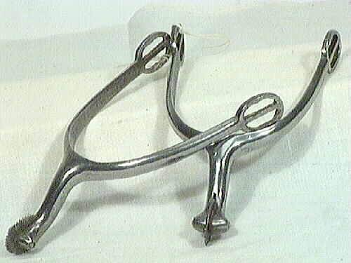 Sporre, par använt av ryttare. V-form att trä runt hälen. Längst ut på varje skänkel finns hål för läderrem att binda fast sporren på foten med. I andra änden finns en liten stång med en rund liten platta som roterar i en springa som är skuren i järnstången. Plattan roterar på liten spik. Runt kanten på plattan är små taggar utskurna. En del taggar är trasiga eller böjda. Järnstången som plattan är fäst i är böjd för bättre kontakt med hästen.