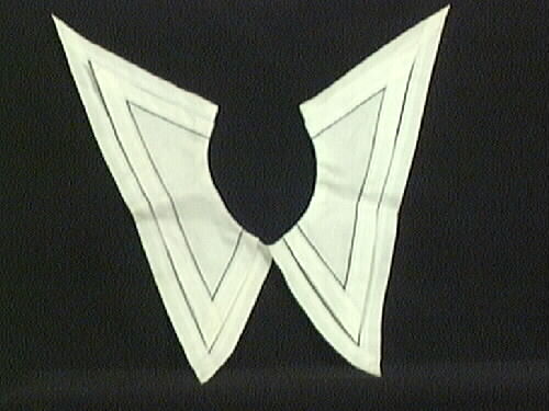 Sorgkrage av vit muslin. Kragen är dubbel, den undre, största, är 490 mm lång och 130 mm bred. Den övre är 370 mm lång och 100 mm bred. Kragarna är dekorerade med ett smalt svart band instt i fållen. Brukad av Hilma Kjellberg, d 1935, Storeberg (tid Storeby).