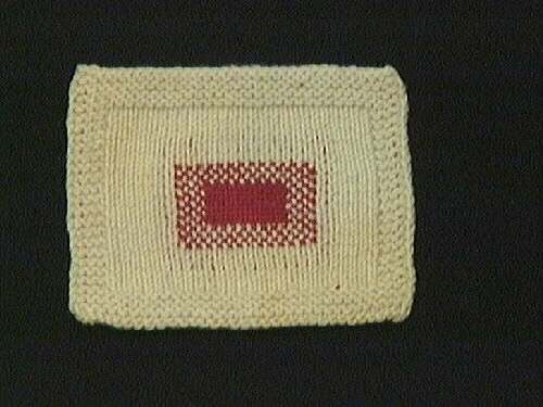 Stickningsprov. Fyrkantig sticklapp av vitt bomullsgarn med stoppningsprov med rött garn, tuskaft. Tillverkat av Maria Hellberg, Lugna Hemmet, Lidköping (f 1852, d 1930). Proverna gjordes på Hulda Lundins seminarium, Stockholm, 1892. Se även: 5M16-7257, 7258, 7259, 7260, 7261, 7162, 7263, 7264, 7266, 7267, 7268, 7269, 7270, 7271, 7272, 7273, 7274, 7275, 7276, 7277, 7278, 7279, 7280, 7281, 7282, 7283, 7284, 7285, 7286.