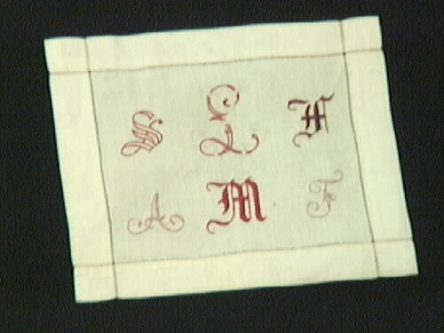Märkduk, fyrkantig, av linneväv med sex olika monogram sytt med rött, blått och vitt garn. Från vänster till höger med början i övre vänstra hörnet är stygnen: