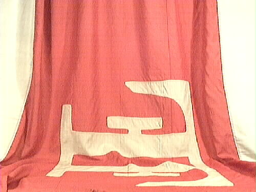 Flagga, röd med en oblekt ram. I mitten ett spegelvänt "F". En snodd i ena kanten, en gulmetallring i den andra.