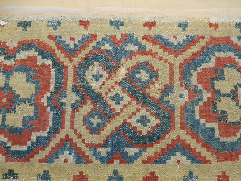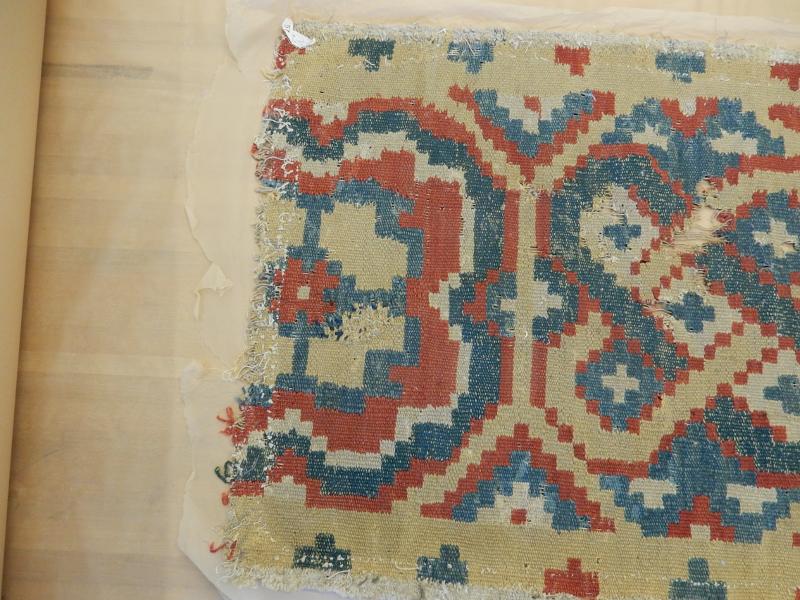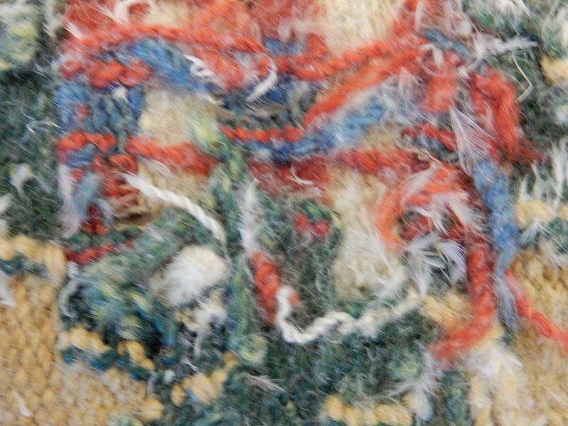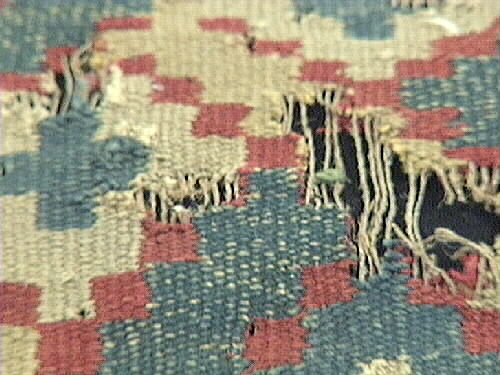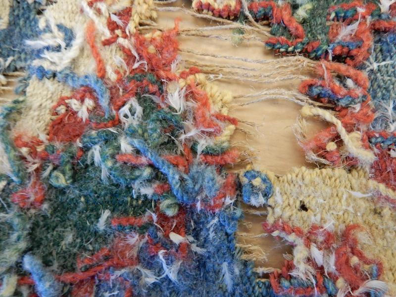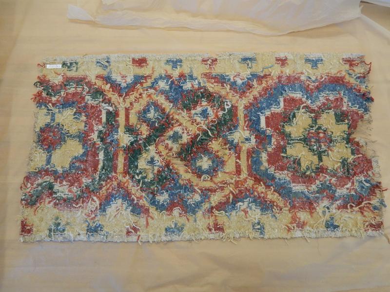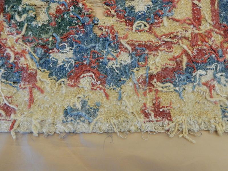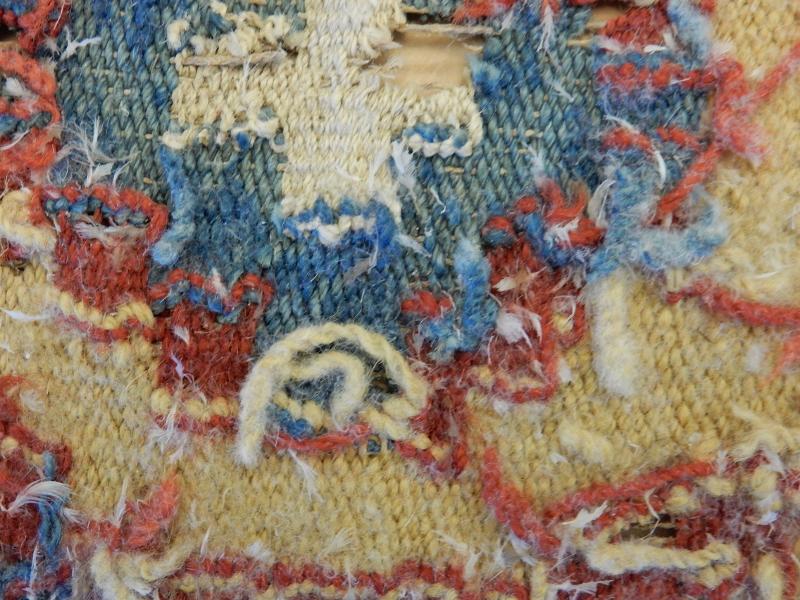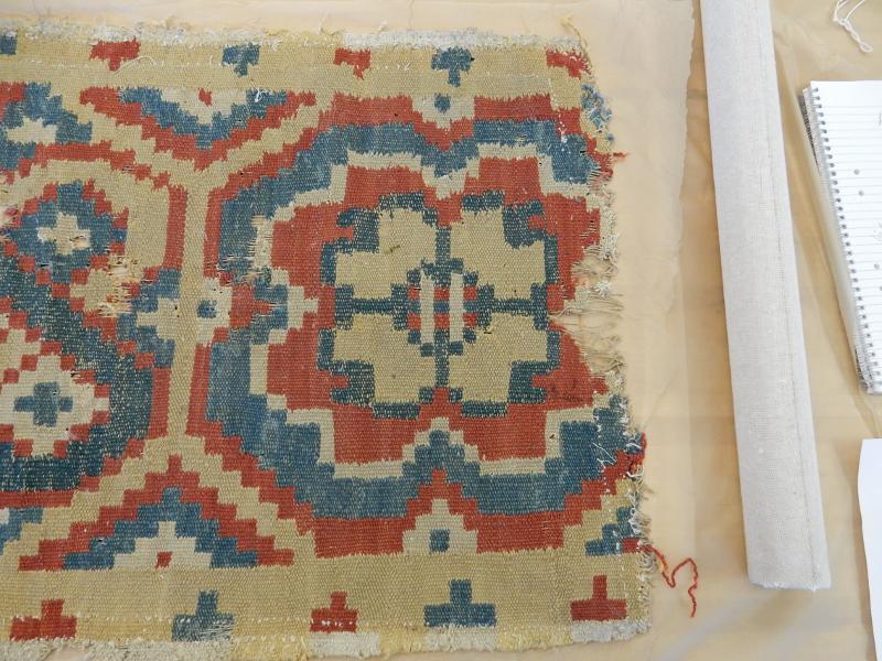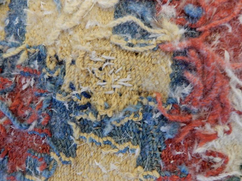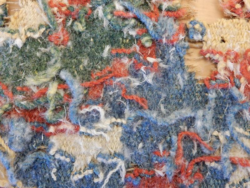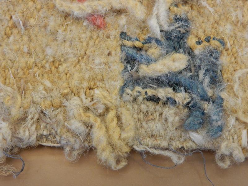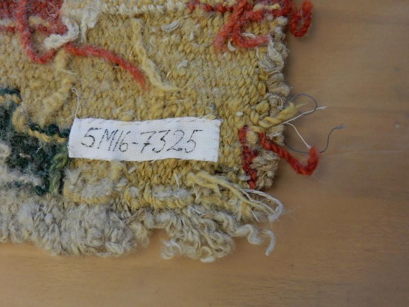 Bildtexter: 1. Rätsidan. 2. Rätsidan, närbild, med slitage. 3. Rätsidan. 4. Vänster kortsida. 5. Höger kortsida. 6. Avigsida. Här syns att rätsidans grova mörkare blå fält, där färg ser ut att ha släppt, är gröna från början. Det kan ha varit ett växtfärgat blått garn som överfärgats med en gul färg som inte varit hållbar. 7. Avigsida detalj. 8. Avigsida detalj. Alla färgerna syns. 9. Avigsida detalj. Dunrester. 10. Avigsida detalj. 11. Avigsida detalj. 12. Avigsida detalj. 13. Avigsida detalj. 14. Avigsida detalj. Den gröna färgen syns. 15. Avigsida detalj. Märkning. 16. Avigsida detalj. Lagning. 17. Avigsida detalj. Inslag fattas. 18. Avigsida detalj.