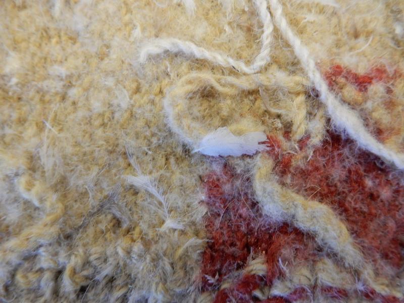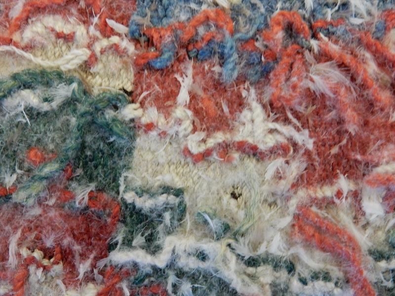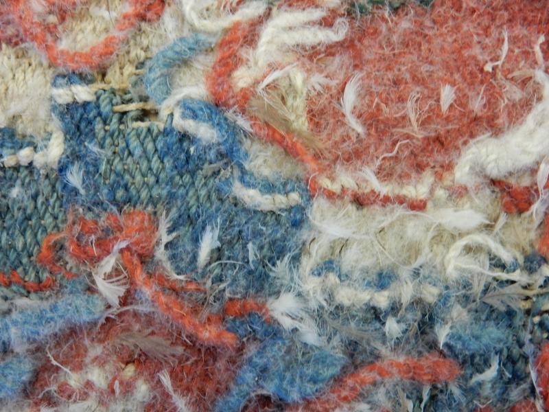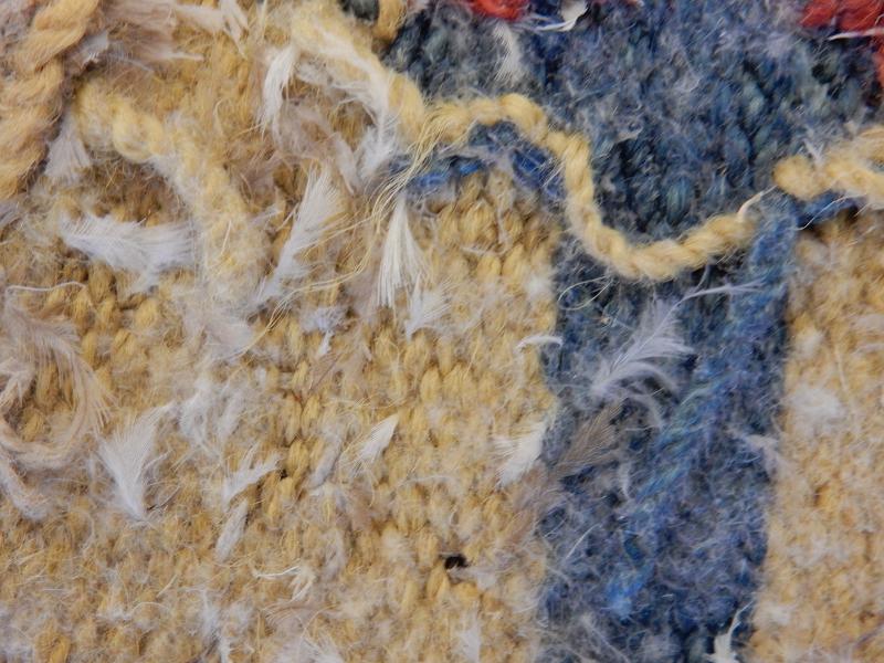 Sittdyna, bänkdyna, vävd på varp av lintråd, 3-3,5 tråd/cm, med inslag av ganska tjockt handspunnet ullgarn, 9 st/cm, ca 2 500 meter/kg (filtgarn är lite tunnare, 3 000 m/kg).