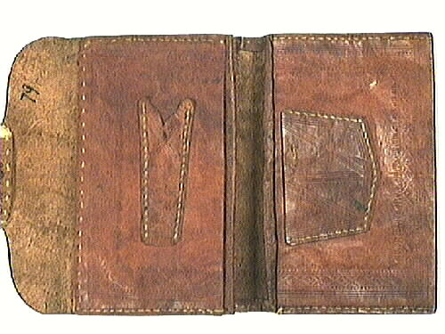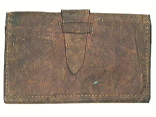 - Plånbok av brunt läder, uppvikbar, fyra stora fack. Hopvikt hålls den samman av en läderflik som fästs i två "kanaler". Pressade mönsterdekorationer i lädret. Där läderfliken är fästad är ett mönster utskuret i lädret samt en ljus läderbit fastsydd under. Plånboken har tillhört urmakare Vilhelm Strömberg och är en gåva av fru Nanny Strömberg, f 1893, d 1962. Nanny var dotter till Vilhelm Strömberg. Hon gifte sig med kapten Strömberg i Stockholm. Vilhelm Strömberg hade urmakeri i Strömbergsgården på Stenportsgatan.