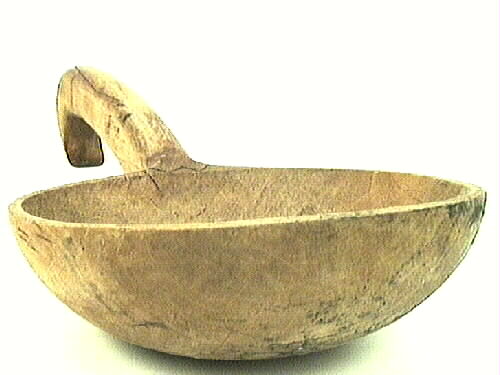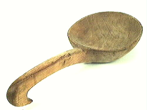 Slev, mycket stor slev skuren i trä med skaft avslutat i en krok. Den stora slevskålen är platt undertill. En sparsam dekoration där skaftet mäter slevskålen.