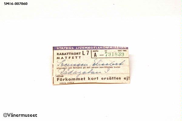 Ransoneringskort, rabattkort på matfett. Kortet har serienummer.