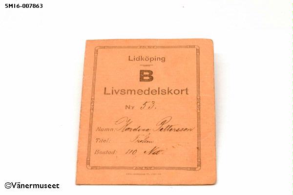 Ransoneringskort på livsmedel, kött. Rosa kort som stämplas i rutorna vid varje köp.