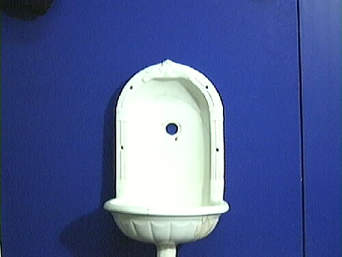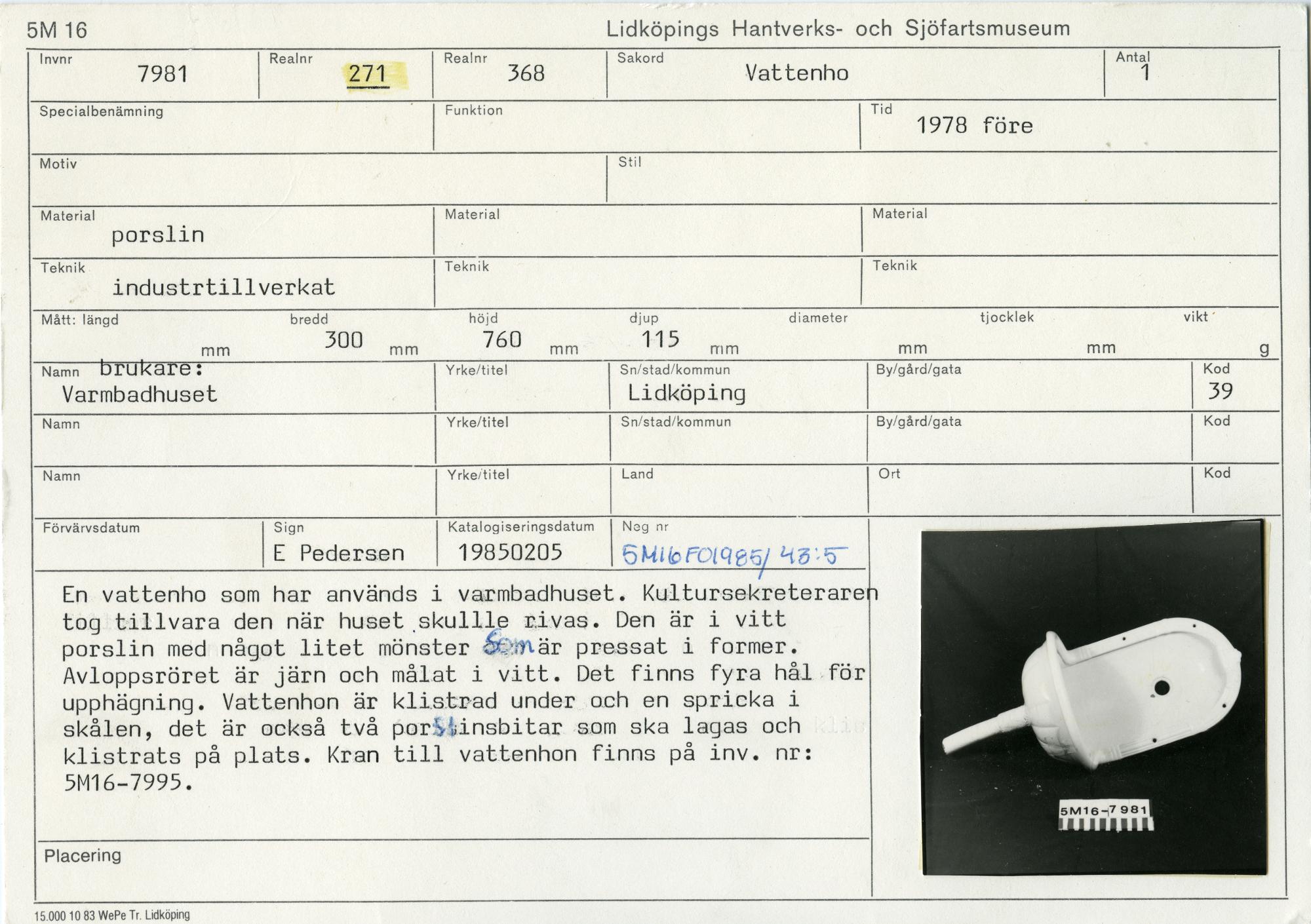 - Vattenho som använts i varmbadhuset. Kultursekreteraren tog tillvara den när huset skulle rivas. Den är i vitt porslin med något litet mönster som är pressat i formen. Avloppsröret är av järn och målat i vitt. Det finns fyra hål för upphängning. Vattenhon är klistrad under och har en spricka i skålen. Det är också två porslinsbitar som ska lagas och klistras på plats. Kran till vattenhon finns på inv nr 5M16-7995.