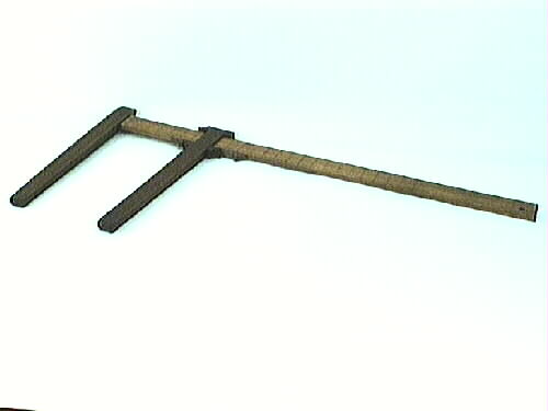 Skjutmått av trä, med 20 mm på varje streck som är gjort på mätstickan.Troligen hemmagjort av någon snickare.