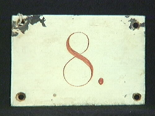 Nummerskylt. Har troligen suttit på hytterna. Vit med röd siffra nr "8". Fyra hål att fästa den i. Kultursekreteraren tog vara på den när varmbadhuset revs 1978.