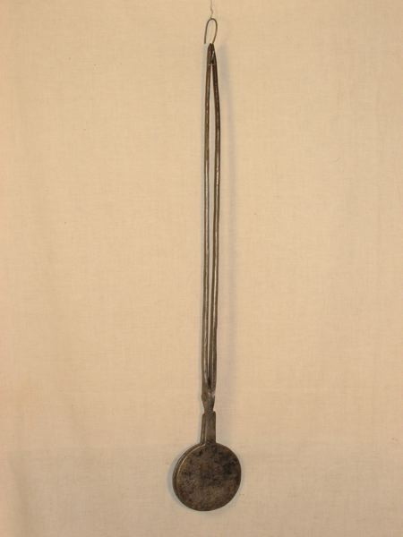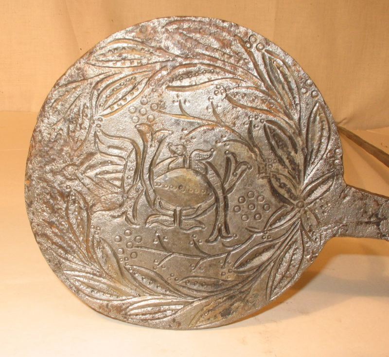 Tunnrånsjärn med runt gräddningsjärn. Mönstret på den ena laggen är två spegelvända C som korsar varann och bladrankor runt omkring. Den andra har blommor och bladrankor. Skalmarna är 780 mm långa. Tunnråndsjärnet är en aning rostigt.