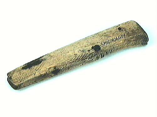 Glätträ. Träbit med rektangulär form. Putsdelen, dvs ovansidans mitt, är något uppböjd. På träet finns beckrester samt ett antal små, ytliga hålmärken. Glätträet användes för glättning av sulan vid bottning eller halvsulning av skor.
