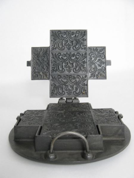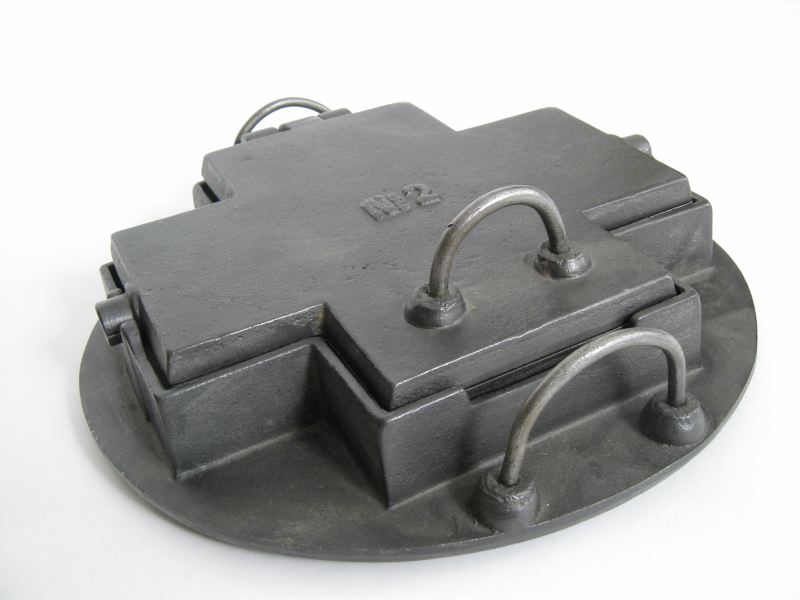 Rånjärn med rund bottenplatta och fals. Två slutna handtag, ett i fram- och ett i bakkant. Bottenplattan har ett korsliknande hål med 30 mm höga kanter. Laggen har plats för fem rån, tre stora och två små, alla med mönster. Laggen hänger i två spår och kan vändas helt om. Ovansidan har ett slutet handtag och har ingjutet i godset "No 2". Laggen har formen av ett kors och passar in i hålet på bottenplattan. Rester av smet finns i laggen.