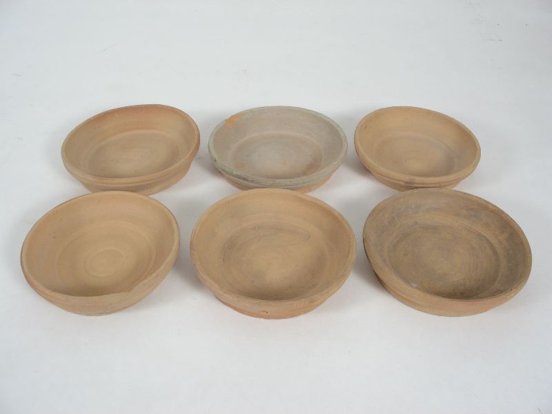 Fat, 6 fat av ljus lera, runda. En extra fördjupning på botten, ca 87 mm, smal nertill och bredare upptill.