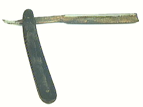 Rakkniv med blad i stål. Skaftet i svart ebonit. Knivbladet kan fällas in i skaftet. Bladet är fäst i en kopparnit. Handtaget är svagt böjt.