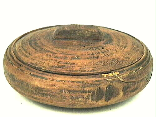 Ask, rund med skruvlock. Har tidigare varit utställd i ryggåsstugan som revs år 1950. Locket har ett litet handtag mitt på. Locket är falsat inuti. En spricka i randen. Två större skador på utsidan. Locket har maskhål. Asken har fragment kvar av en svartaktig färg.