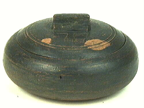 - Ask, rundsvarvad, med skruvlock. På locket ett litet handtag. Ovanför handtaget står "ELD", under handtaget "1717" utskuret. Locket är profilerat. Locket är falsat inuti. Asken och locket är målade med en svartgrön, betsliknande färg.
