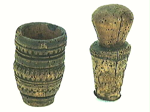 Kryddstöt. Utsidan utsirad med svarvade ringar och karvsnitt. På insidan rester av 5 spik. Stöt med järnplatta på undersidan. På plattan, som är ganska sliten, finns några spikhuvudliknande utsprång. Stöten och handtaget på stöten lätt kägelformiga. Många maskskador.