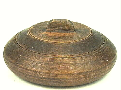 Skruvlockask, rund, konvex med plan botten. Invändigt svarvad. Ovandelen består av skruvlock med plan ovandel, där ett litet handtag sitter. Brunmålad. Skruvkant på ovansidan av asken liksom på locket. Stängningsbart lock. Nött, en del mindre märken på utsidan.
