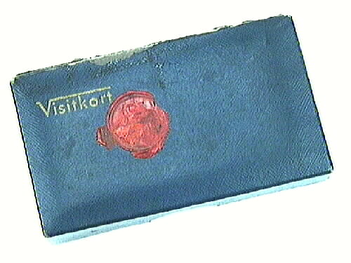 Visitkortlåda av papp klädd med mörkblått präglat papper. Lack med stämpel på locket ("Lisa"). Innehåll: 1.-2. Lackstumpar, 3. Lacksigill, "Lisa", runt i mässing med svarvat handtag.