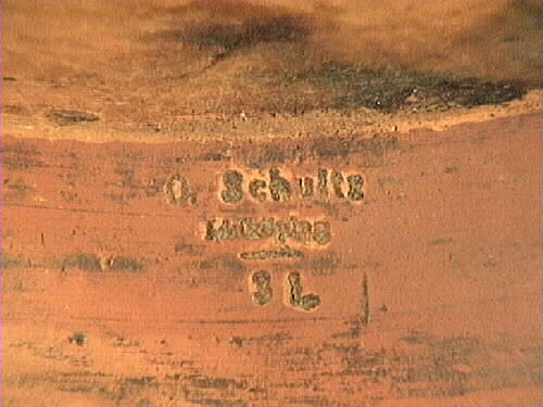 - Fat, runt, av rödbränd lera, inuti mörkt brun glasyr. Svagt profilerad kant mitt på manteln. Stämplat: "O Schultz, Lidköping, 3L (f 1857, slutade verksamheten 1936). Inköpt på Hantverket, Grevhusgatan, för 200 kronor.