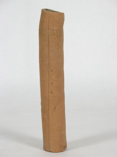 Tegelrör, ojämt, svagt, böjt, orange. I ena änden instämplat SÅTENÄS. Såtenäs tegelbruk, 1858-1935 ca. Ägdes av Såtenäs säteri.
