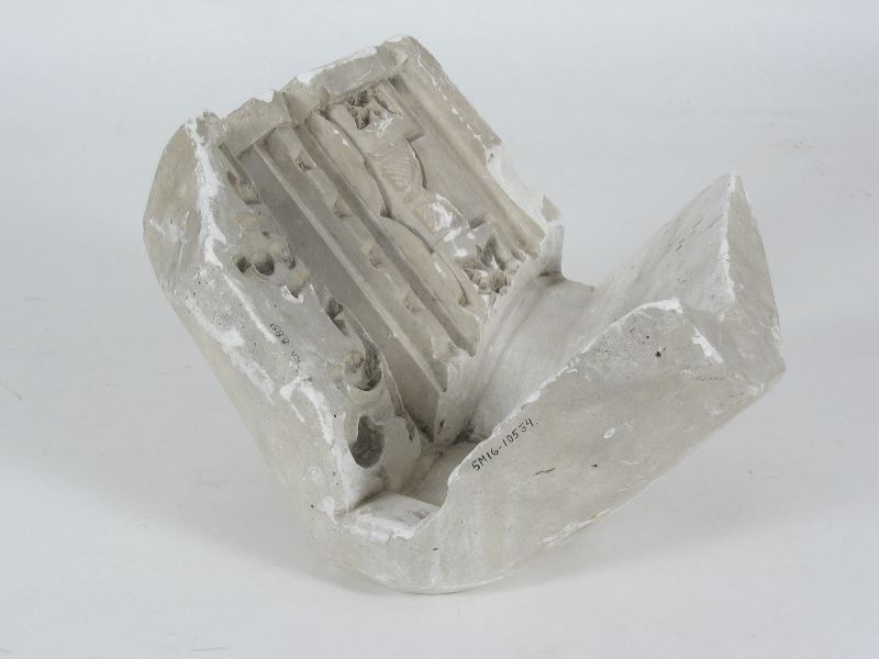 Gjutform av gips för gjutning av kakelugnshörn. Gavelsidan av hörnet slät och framsidan ornamenterad med bl a bladformationer. Formen är något kantstött.