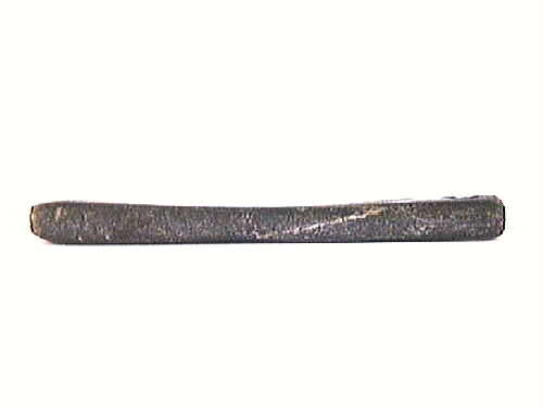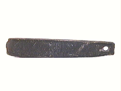 Skifferhänge. Rektangulär form, något konisk, ett hål borrat i ena änden.