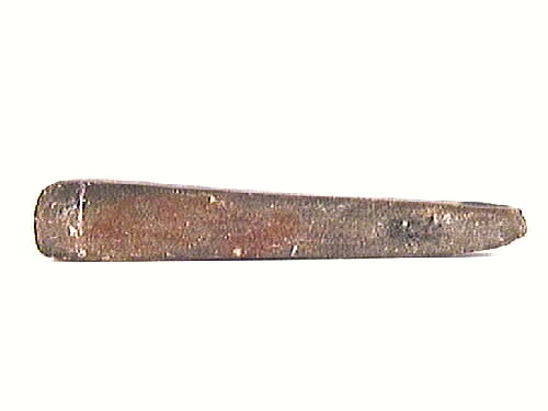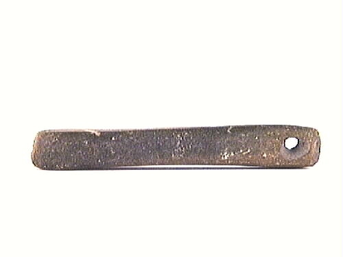 Skifferhänge. Rektangulär form, tunnare i ena änden och ett hål där.