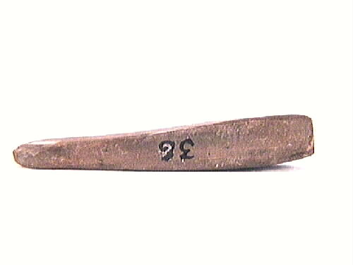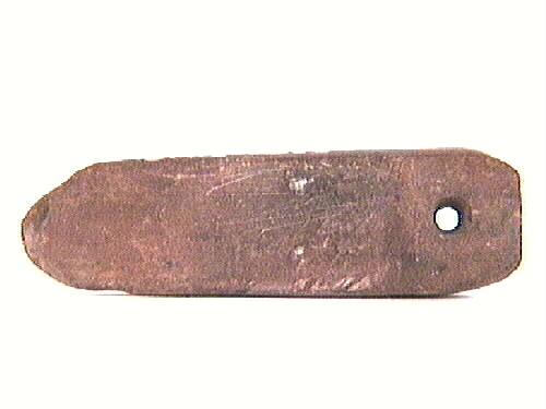Skifferhänge. Rektangulär form, tjockare i ena änden och ett hål där.
