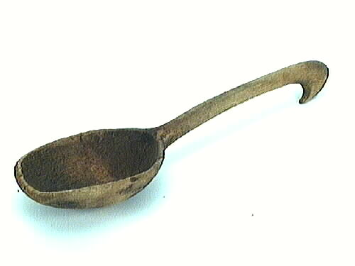 Snidad slev i trä. Djupt kupad sked med skaft som avslutas med krok.