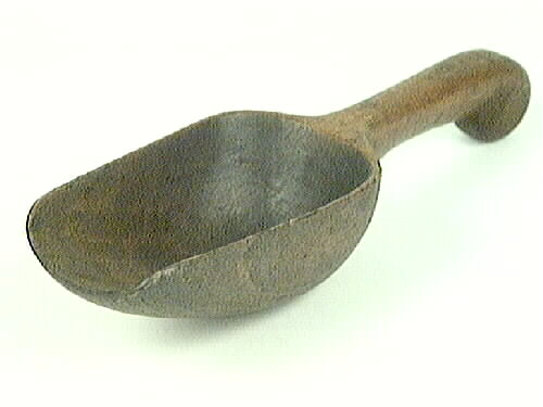 Skopa skuren i trä. Med ett 90 mm långt trekantigt skaft med lätt rundade kanter, omkring 15 mm brett och nedåtsvängt till en jämnbred rulle. Skopbladet är urholkat, med 31 mm i djup. Raka rundade sidor ut- och invändigt. Framkanten är kraftigt rundad. Sned rundad botten. Svärtad. Några repor och hack på skopbladet.
