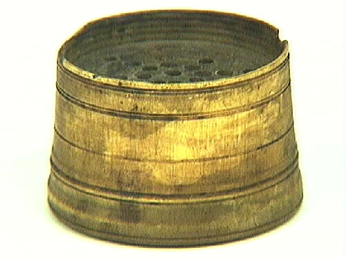 - Sanddosa svarvad i horn. Rund, något avsmalnande upptill. 7 mm från överkanten sitter ett fast lock med rader av små hål i form av en stjärna. Ovanför locket är insidan gängad. Plan botten med tre cirklar. Sidan är dekorerad med flera längsgående linjer. På locket finns tre cirklar. Färgen skiftar i ljust och mörkt. Innehöll fin sand, som pudrades på den färska bläckskriften för att den skulle torka fortare. Det var innan läskpapperet var känt. Övre kanten har en del skador. Sidan och botten är något slitna. En liten spik är islagen i nederkanten i botten. Några sandkorn är kvar.