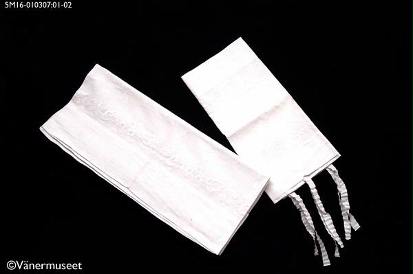 Örngott, längd 550 mm, bredd 390 mm. Bred påsydd kant runt om. Innanför kanten plattsömsbroderi i form av blad- och blomsterslinga. 3 par isydda knytband. Enligt medföljande lapp "användes av fam Lidbeck vid bröllop och barndop".