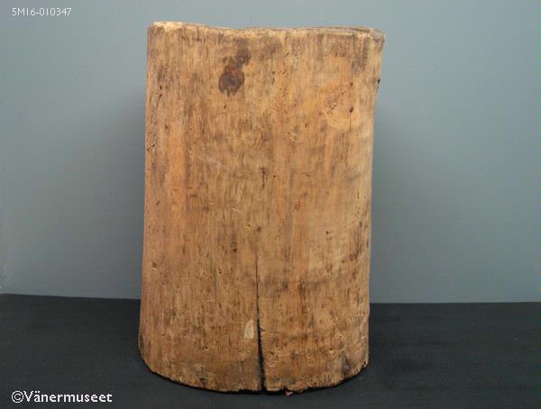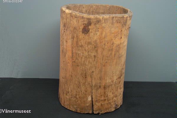 - Träholk med något oval grundform tillverkad av en urholkad stock. Botten fastspikad. En stor samt några mindre sprickor i träet. Vid botten tätad med vidja och trasa. Mycket maskäten. Många spikar ca 100 mm under kanten.