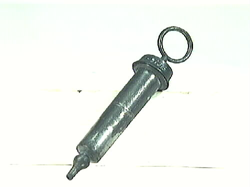 - Sårspruta. Cylindrisk behållare med diameter 15 mm och två tunna, parallella skåror på utsidans mitt. Spetsen är kupolformad. Behållarens ovandel har en spetsig kant och innanför finns gängor, där ett lock sitter. Locket har ett runt, genomgående hål på ovansidans mitt. Igenom detta går en stav med en ring överst. Nederst en kolv med mellanpartiet lindat med textiltråd. Användes till rengöring av sår.