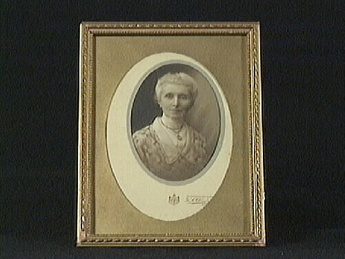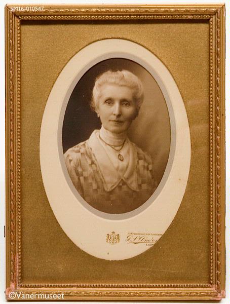 - Foto, inramat i rektangulär, förgylld träram med svart baksida och uppsättningsanordning. Denna är lagad. Runt fotot guldfärgad kartong i vilken en oval är utskuren, vari fotot är placerat. Fotot föreställer grevinnan Isabella Hedvig Francis Wilhelmina von Kock. Född i Berlin 1862-07-01. Hon var dotter till Hedvig Alida Isabella och Nils Tomas Grote von Kock, Senäte. Fadern titulerades kammarherre. Han dog 1911. Grevinnan Isabella von Kock var ogift. Hon var konstintresserad och målade. Efter föräldrarnas död bodde hon kvar på Senäte och dog där 1932-02-15. Hon ligger begravd på Senäte gravplats. Fotot har tillhört kusken Johan Svensson, Senäte, f 1853-09-16 på Högaledet, Kållandsö. Han fick det i gåva av grevinnan. J Svensson avled 1941-08-02. Gåva till museet av Bror Iversson, Östbygatan 15 C, Lidköping, barnbarn till J Svensson.