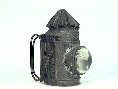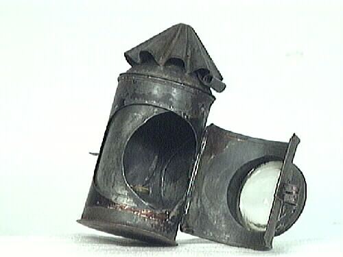 Lykta för ljus. Cylinderformad med lucka, vari ett kupigt glasfönster är monterat. Luckan har fungerande stängningsknapp. Taket är veckat och toppformigt. Man kan lyfta upp den inre delen om man lyfter i taket. På baksidan av lyktan finns två bågformade handtag som sitter parallellt vid vardera sidan om en rak plåtbit som fungerar som upphängningsanordnig. Löstagbar behållare inuti med hål, vari ett ljus placeras.