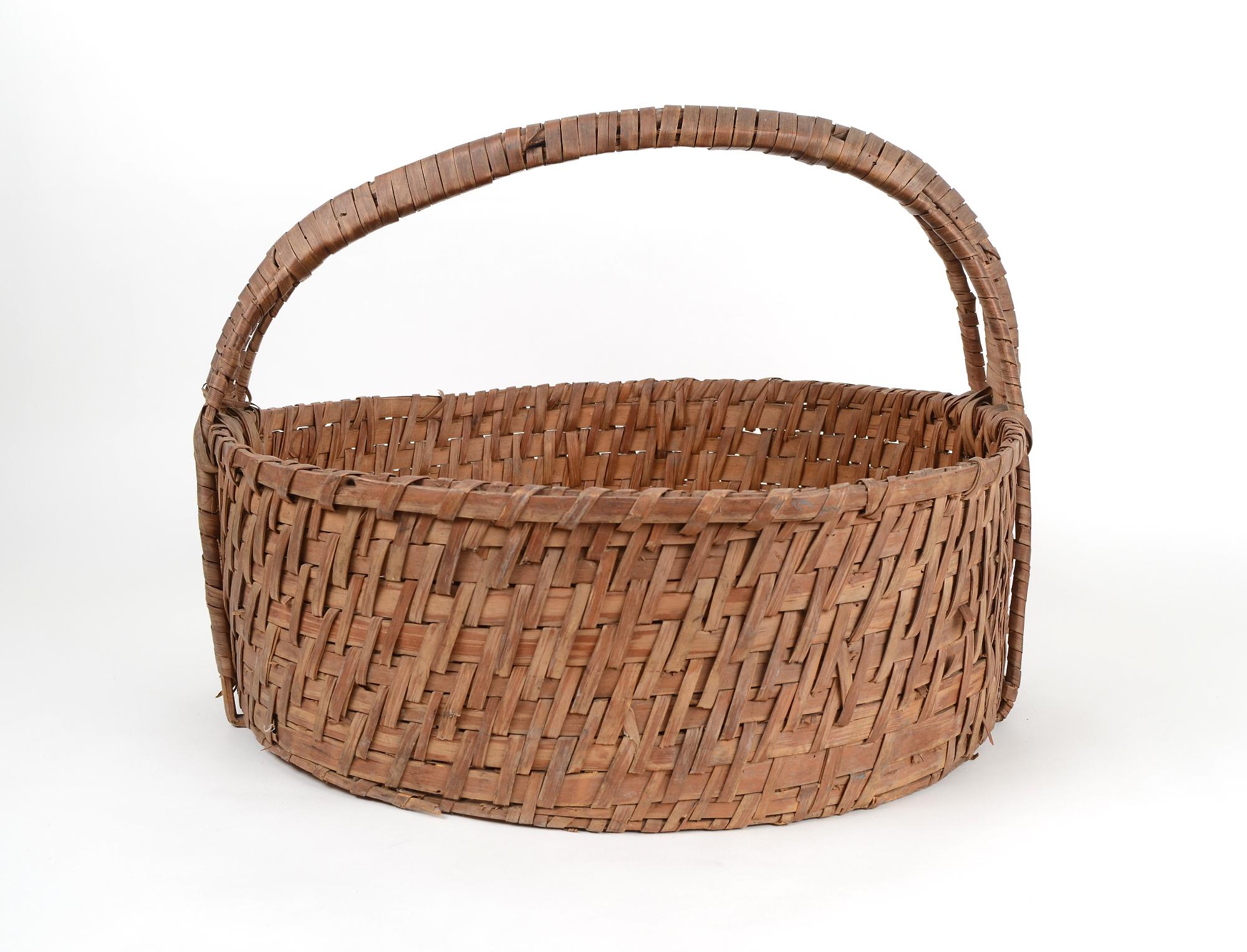 Korg, förningskorg av flätat spån. Korgen är rund med raka sidor och plan botten. Bågformad grepe som delar sig i tre delar, där den är fästad vid korgen. Dessa tre delar löper rakt över bottendelen och fortsätter i andra grepändan.