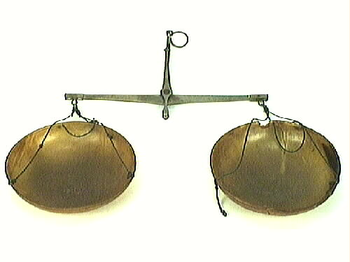 Balansvåg med vågskålar i horn med diameter 168 mm. Vågskålarna är fästa i oket med snören som i skålarna sitter i tre hål. Vågen hålls vid vägning med ena handen eller hängs upp. I okets förlängning uppåt finns en visare som reagerar på tyngden i de båda skålarna. Oket av mässing. Den ena skålen sprucken och trasig i kanten.