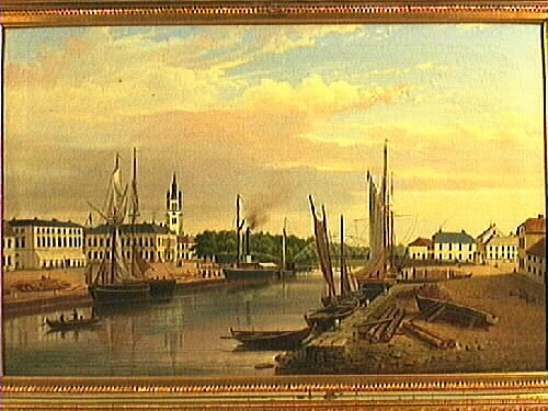 Oljemålning, Lidköpings hamn från norr: Vid kajerna segelfartyg och ångfartyget LIDKÖPING. Ramad med bred förgylld ram. (Troligen från Torsells verkstad. Tidningsurklipp på baksidan om målningen och målaren. Tillverkad av målarmästare Adolf Liedegren (1833-1896).