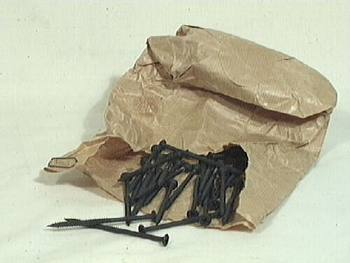 Gipsskruv av svart stål i bunt. Innehåller 30 st. För stjärnskruvmejsel. Användes till gipsplattor. Skruvarna förvaras i en ljusbrun papperspåse, denna är trasig.