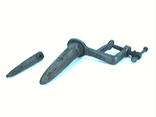 Pipjärn.Stort. Strutformat, ihåligt, vari det värmda toppformiga lodet skall placeras. Skruvanordning för fastsättning. Lock saknas. Pipjärnet användes för strykning av krås eller kragar med veckning.