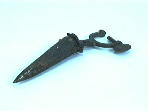 Pipjärn. Strutformat ihåligt, vari det värmda, toppformiga lodet skall placeras. Lodet saknas. Skruvanordning för fastsättning. Överdelen fungerar som ett lock. Pipjärnet användes för strykning av krås eller kragar med veckning. Användes i skrädderi.