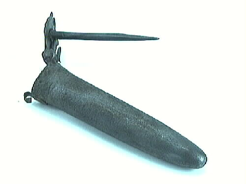 Pipjärn. Strutormigt, ihåligt, vari det värmda toppformiga lodet ska placeras. Lodet saknas. Överdelen fungerar som lock, i dess förlängning toppig ståndare. Någon fastsättningsanordning finns ej. Pipjärnet användes för strykning av krås eller kragar med veckning. Användes i skrädderi.