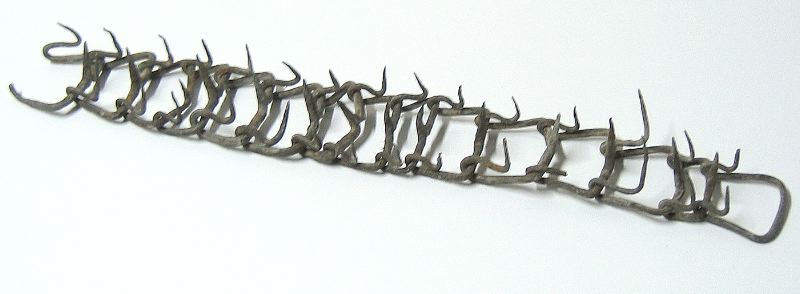 Hundhalsband. Består av en kedja av 15 delar med vardera två taggar. Dessa kopplas ihop. Det saknas en del med vilken halsbandet sattes ihop. Enligt tidigare katalog "För att vargarna ej skall kunna bita hunden i strupen".