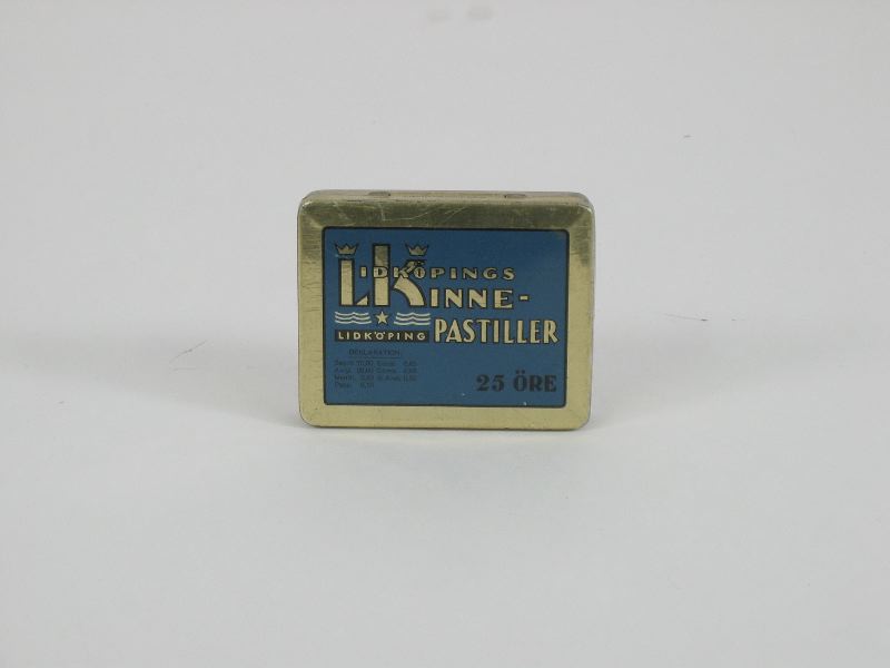 - Karamellask, guldfärgad med blått fält. På locket text i guldfärg och svart "LIDKÖPINGS KINNEPASTILLER, LIDKÖPING, 25 ÖRE, DEKLARATION: Sacch. 70,00, Eual. 0,05, Amyl. 29,00. Comp. 0,05, Menth. 0,30, G. Arab. 0,50, Pepp 0,10". På gångjärnet står "ÖREBRO BLECKEMBALLAGEFABRIK". Lidköpings Kinnepastiller var troligen belägen vid Sockerbruksgatan. Fabriken flyttade till Alingsås på 30-talet.
