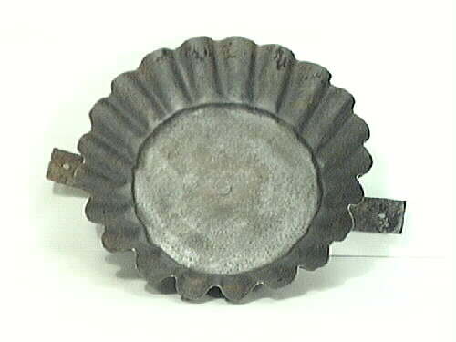 Bakform. Rund med sluttande, veckad kant. En lång, platt plåtbit löper under formen och ut en bit på varje sida. Formen sattes ovanpå järnspisen när ringarna avlägsnats och kakan gräddas över öppen eld. Formen något rostangripen.