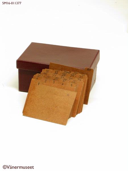 Låda med lock. På utsidan klädd med vinrött papper. I lådan finns kortregister från 1 till 40 samt en kartong framför ihopsatt som en rektangel och en kartong bakom korten ihopsatt som en triangel.